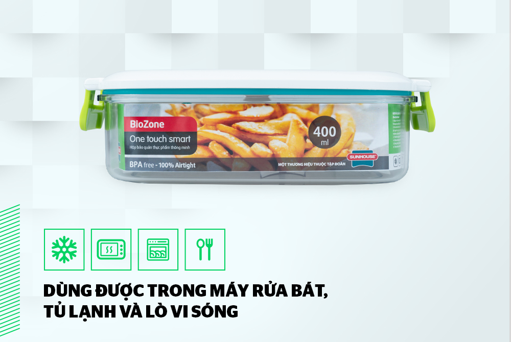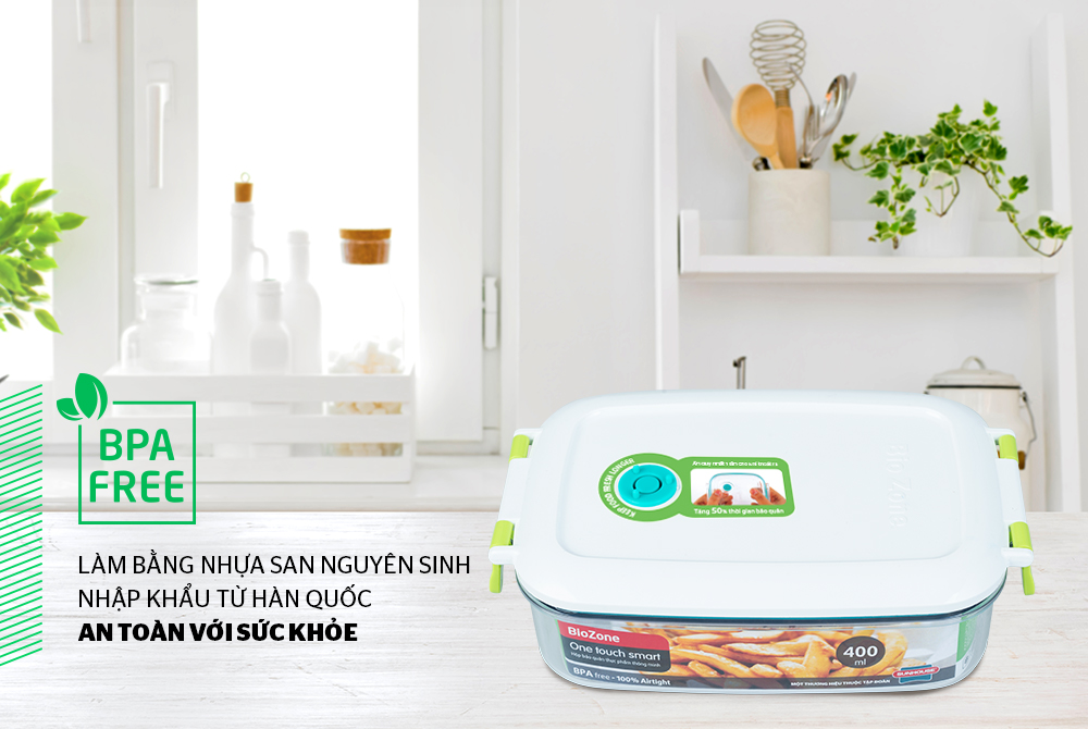 Trong đó, hộp bảo quản thực phẩm thông minh BioZone 400ml là dòng hộp nhựa an toàn phân khúc cao cấp được làm từ nguyên liệu nhựa nguyên sinh, an toàn với sức khỏe, đáp ứng nhu cầu bảo quản thực phẩm đa dạng tại gia đình.