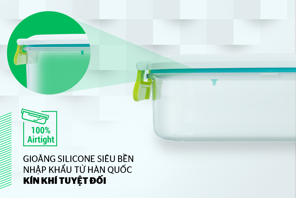Gioăng hộp làm từ silicone, cấu tạo 2 lớp (khác biệt so với các loại thường chỉ có 1 lớp), ở giữa là không khí rỗng, có thể tháo rời khỏi nắp hộp. Đặc biệt, gioăng hộp chịu nhiệt tới 200 độ C, đàn hồi cực tốt giúp cho hộp kín hơi, không lo tràn nước.