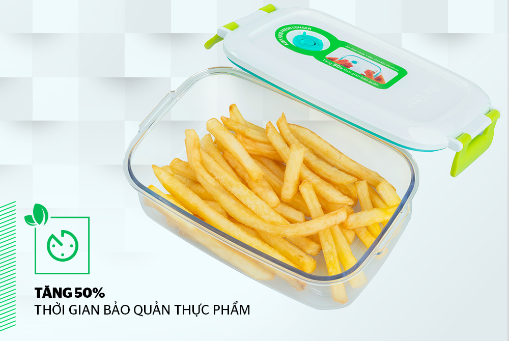 Van silicone trên nắp hộp có tác dụng xả bớt không khí trong hộp chỉ với một lần ấn nhẹ, giúp giảm độ ẩm và tốc độ oxi hóa, ngăn ngừa thất thoát vitamin, giữ nguyên độ tươi ngon của thực phẩm.