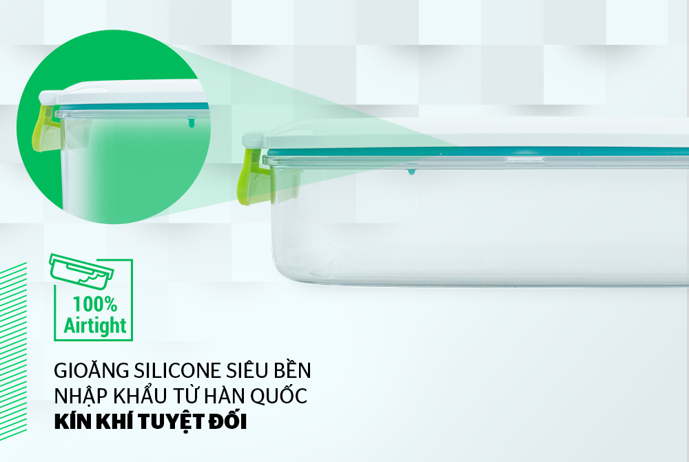 Gioăng hộp làm từ silicone, cấu tạo 2 lớp (khác biệt so với các loại thường chỉ có 1 lớp), ở giữa là không khí rỗng, có thể tháo rời khỏi nắp hộp. Đặc biệt, gioăng hộp chịu nhiệt tới 200 độ C, đàn hồi cực tốt giúp cho hộp kín hơi, không lo tràn nước.