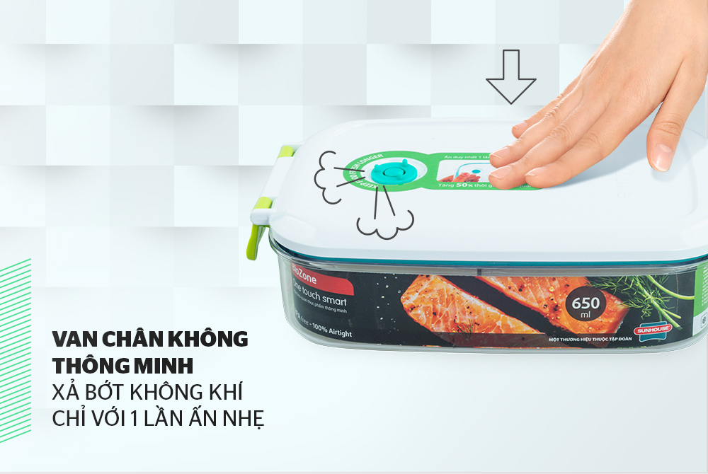 Van silicone trên nắp hộp có tác dụng xả bớt không khí trong hộp chỉ với một lần ấn nhẹ, giúp giảm độ ẩm và tốc độ oxi hóa, ngăn ngừa thất thoát vitamin, giữ nguyên độ tươi ngon của thực phẩm.