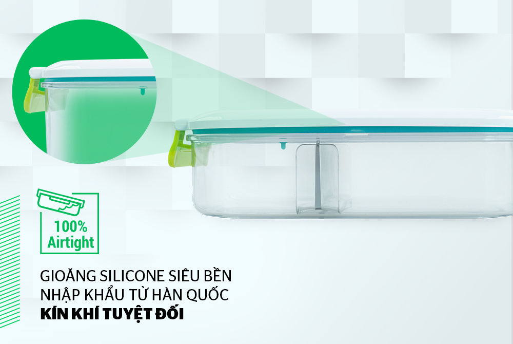 Gioăng hộp làm từ silicone, cấu tạo 2 lớp (khác biệt so với các loại thường chỉ có 1 lớp), ở giữa là không khí rỗng, có thể tháo rời khỏi nắp hộp. Đặc biệt, gioăng hộp chịu nhiệt tới 200 độ C, đàn hồi cực tốt giúp cho hộp kín hơi, không lo tràn nước.