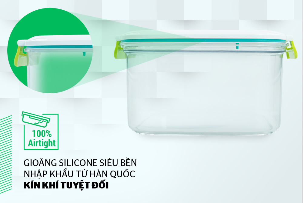 Gioăng hộp làm từ silicone, cấu tạo 2 lớp (khác biệt so với các loại thường chỉ có 1 lớp), ở giữa là không khí rỗng, có thể tháo rời khỏi nắp hộp. Đặc biệt, gioăng hộp chịu nhiệt tới 200 độ C, đàn hồi cực tốt giúp cho hộp kín hơi, không lo tràn nước.