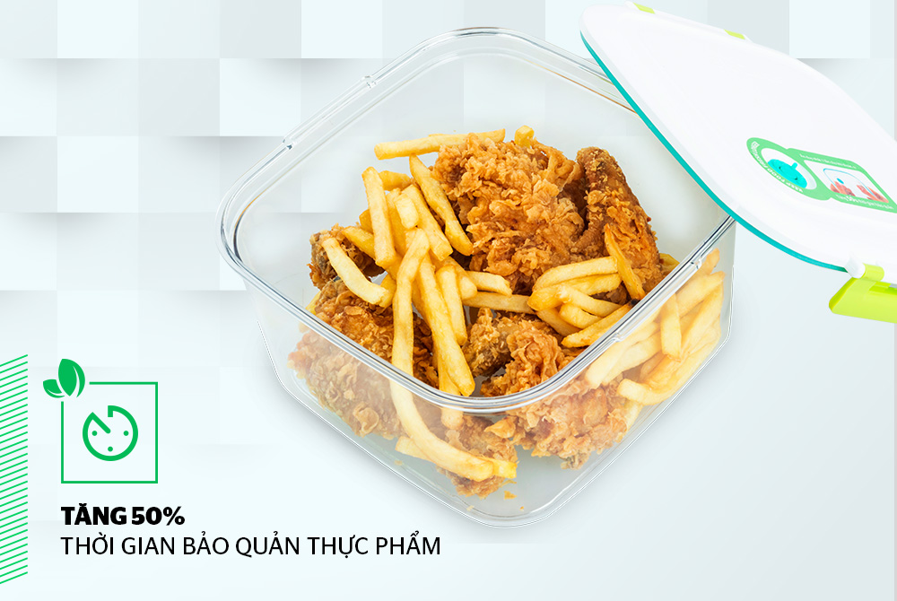 Van silicone trên nắp hộp có tác dụng xả bớt không khí trong hộp chỉ với một lần ấn nhẹ, giúp giảm độ ẩm và tốc độ oxi hóa, ngăn ngừa thất thoát vitamin, giữ nguyên độ tươi ngon của thực phẩm.