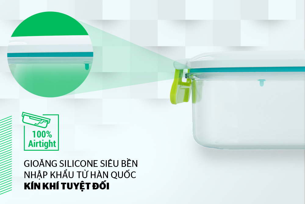 Gioăng hộp làm từ silicone, cấu tạo 2 lớp (khác biệt so với các loại thường chỉ có 1 lớp), ở giữa là không khí rỗng, có thể tháo rời khỏi nắp hộp. Đặc biệt, gioăng hộp chịu nhiệt tới 200 độ C, đàn hồi cực tốt giúp cho hộp kín hơi, không lo tràn nước.