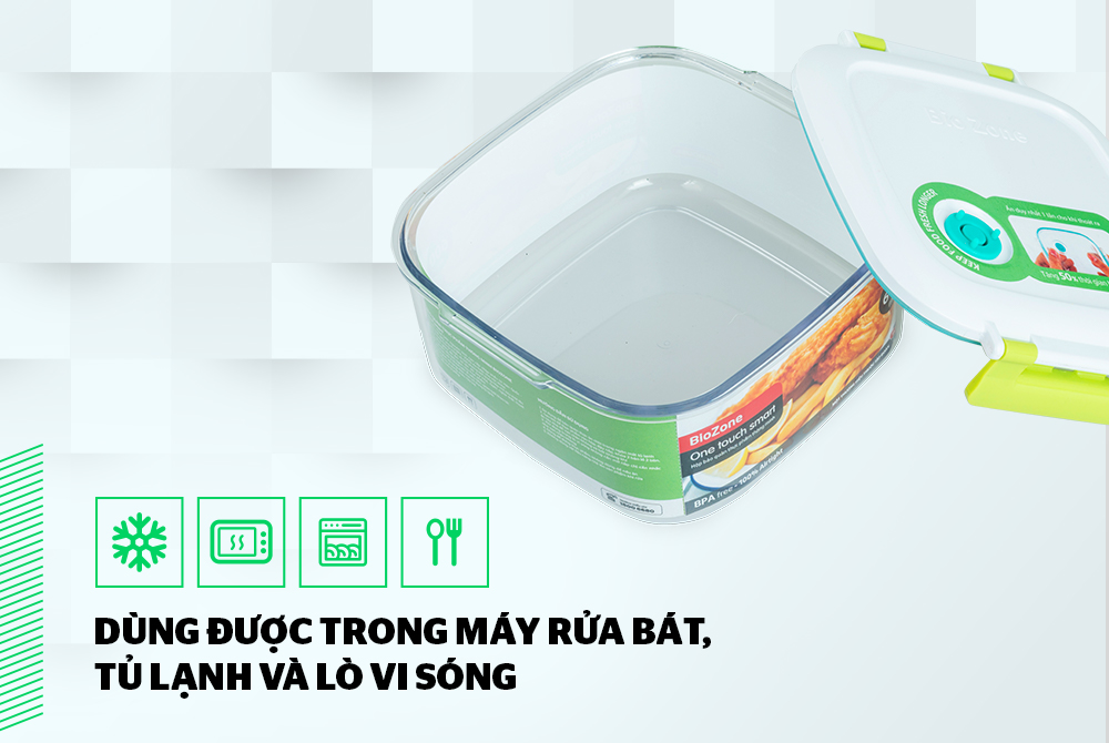 Bạn hoàn toàn yên tâm khi sử dụng hộp BioZone trong tủ lạnh, lò vi sóng và máy rửa bát vì hộp có độ cứng cao, chịu nhiệt từ -30 đến 100 độ C. Đặc biệt, khi dùng trong lò vi sóng, không cần mở nắp, chỉ cần nhấc nhẹ van chân không.