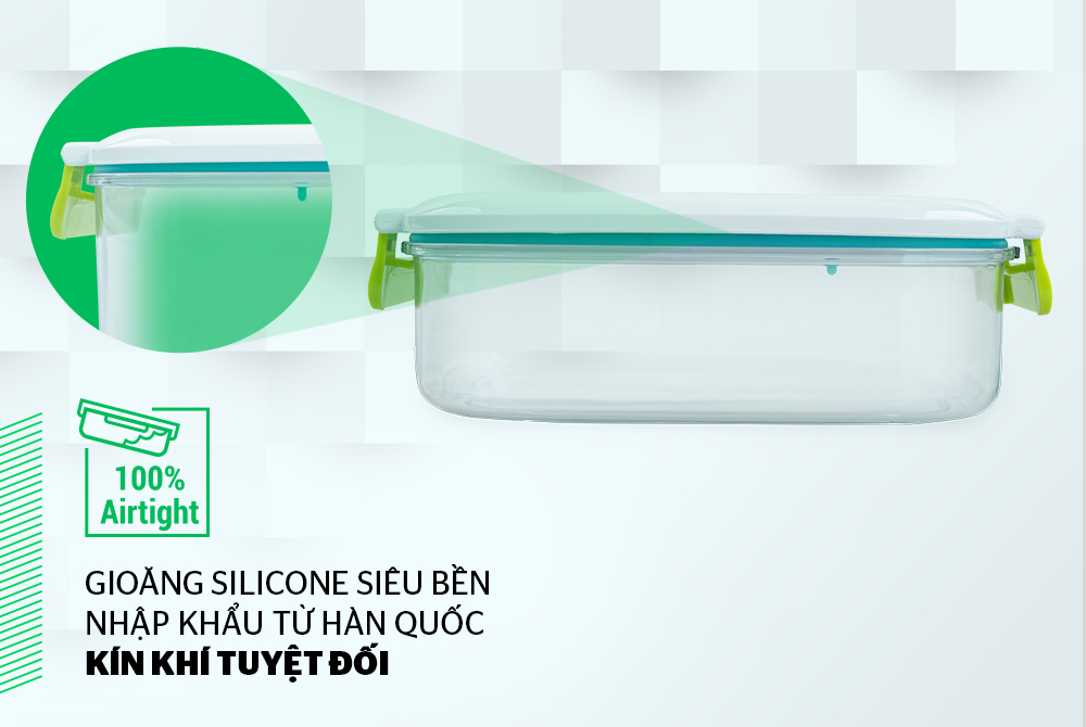 Gioăng hộp làm từ silicone, cấu tạo 2 lớp (khác biệt so với các loại thường chỉ có 1 lớp), ở giữa là không khí rỗng, có thể tháo rời khỏi nắp hộp. Đặc biệt, gioăng hộp chịu nhiệt tới 200 độ C, đàn hồi cực tốt giúp cho hộp kín hơi, không lo tràn nước.