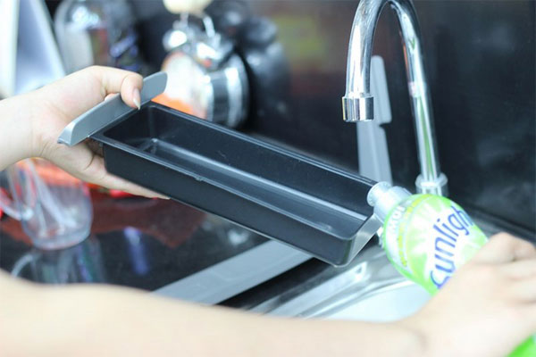 Bước 4: Rửa sạch dầu mỡ bám trên khay chứa bằng chất tấy rửa, sau đó dùng khăn cọ sạch khay chứa.