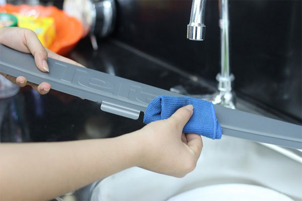 Bước 6: Dùng khăn sạch lau khô nước trên khây chứa và thanh chặn.