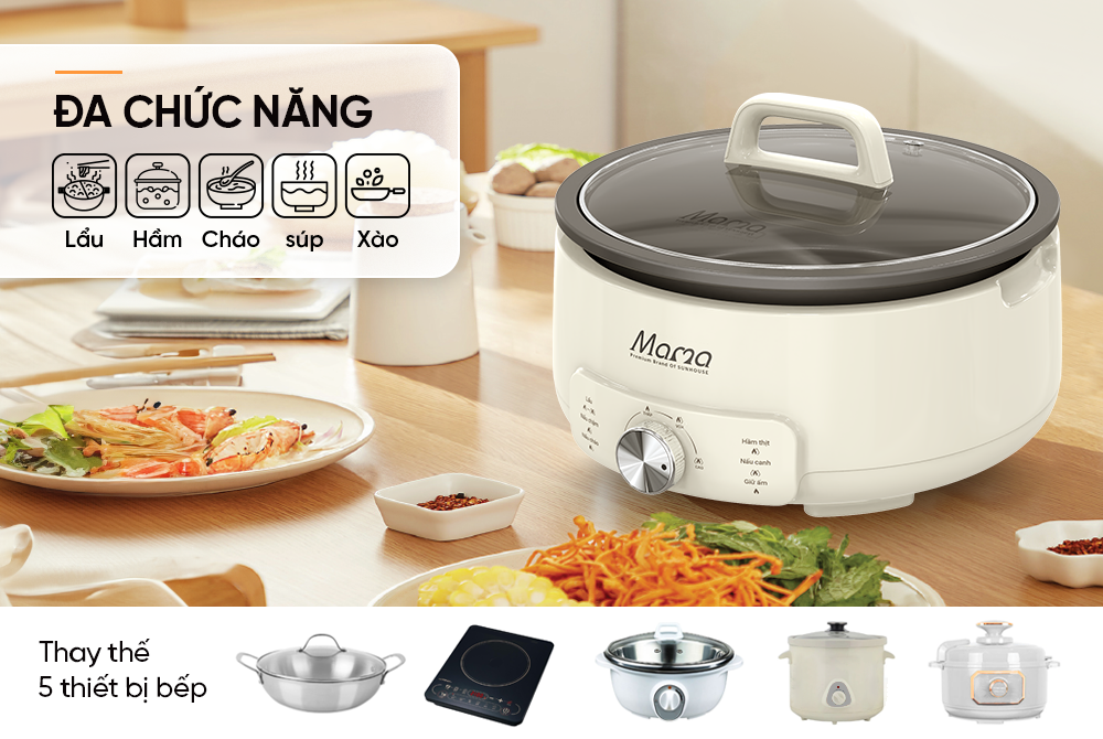 - Thay thế 5 thiết bị bếp: lẩu, hầm, súp, chiên, xào,... trong 1