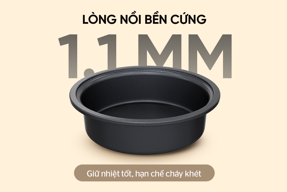 - Lòng nồi bền cứng dày 1.1mm, giữ nhiệt tốt, hạn chế cháy khét