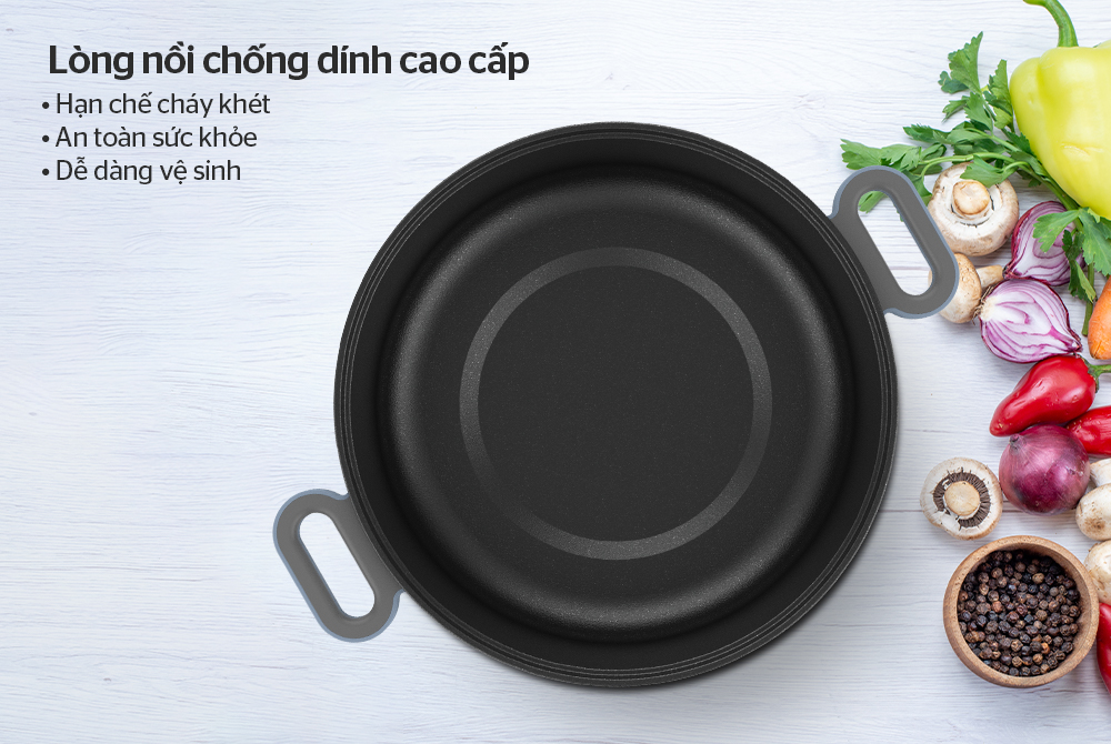 Không những thế, lòng nồi còn được tráng một lớp chống dính cao cấp siêu bền, an toàn cho sức khỏe, không làm phát sinh chất độc hại khi tiếp xúc dưới nhiệt độ cao, tránh bám dính thức ăn, đặc biệt dễ dàng vệ sinh sau khi sử dụng.