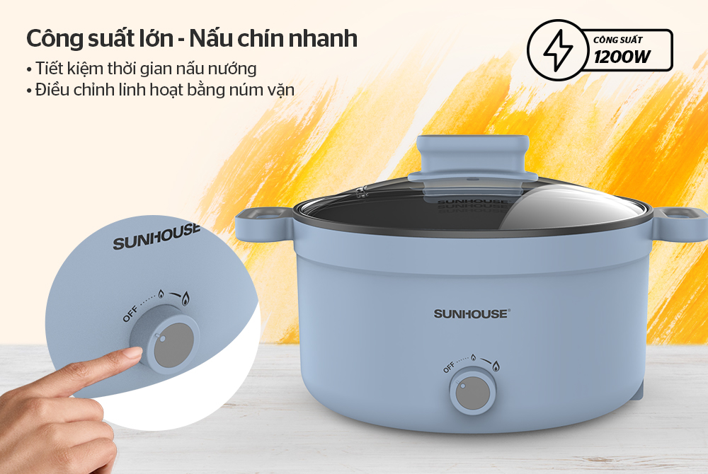 Lẩu điện 3.5L SUNHOUSE SHD4528 có một mâm nhiệt lớn giúp truyền nhiệt nhanh và đều, cùng công suất cao 1200W giúp nấu chín thức ăn nhanh chóng, tiết kiệm thời gian nấu nướng.