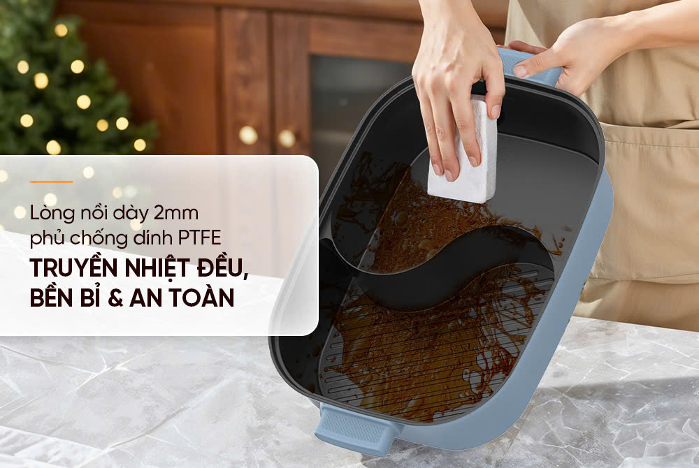 - Chống dính PTFE, bền bỉ, an toàn cho sức khỏe
