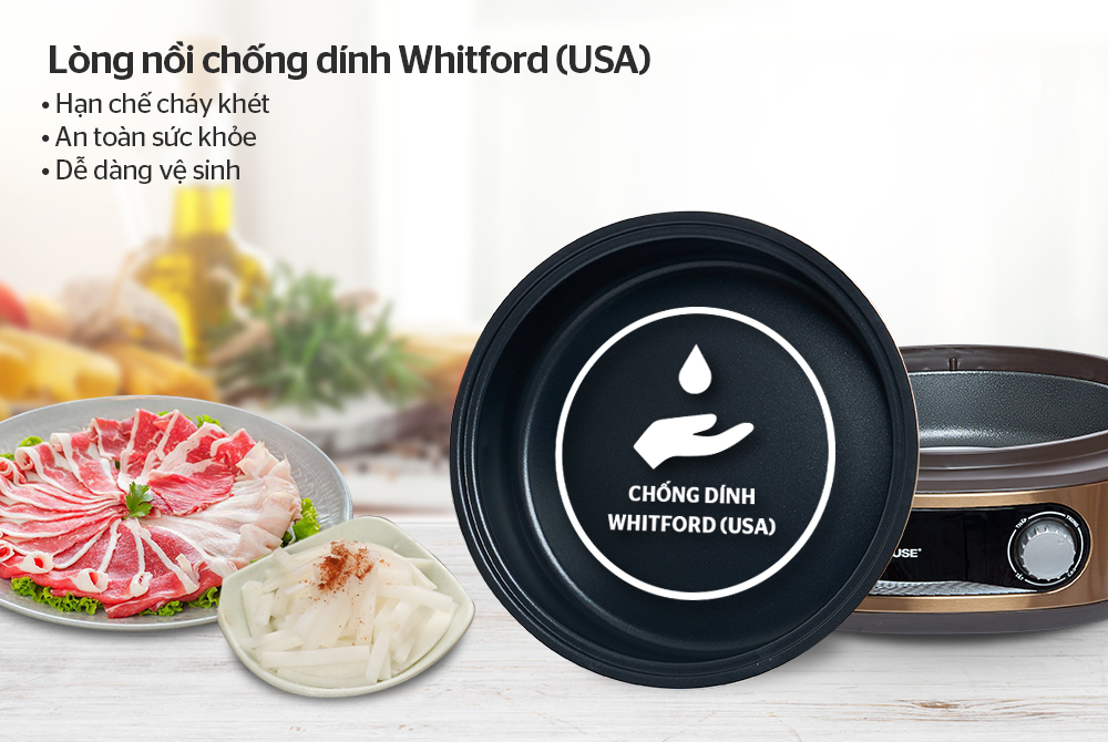 Lòng nồi được làm từ hợp kim nhôm dày giúp giữ nhiệt lâu hơn. Không những thế, lòng nồi còn được tráng một lớp chống dính Whitford (USA) siêu bền, không gây hại cho sức khỏe, tránh bám dính thức ăn và dễ dàng vệ sinh sau khi sử dụng.