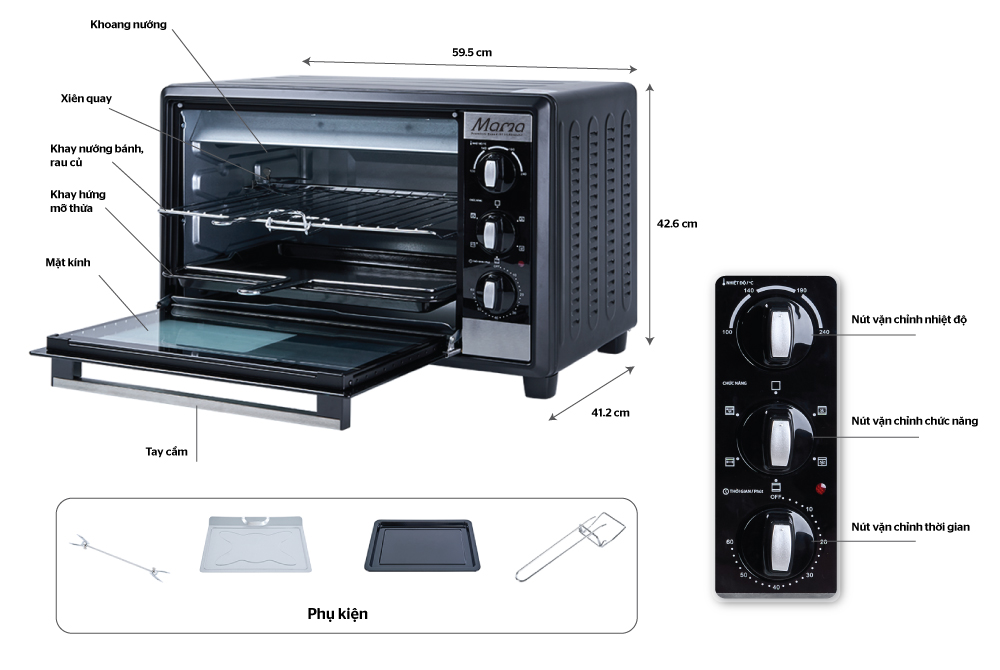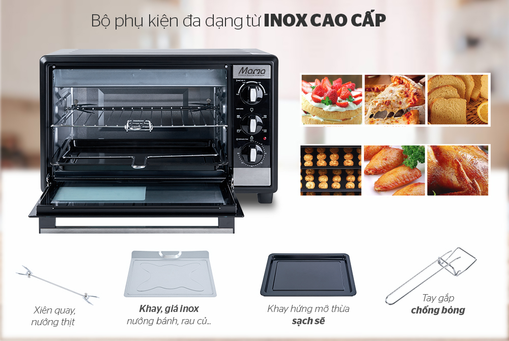 Phụ kiện đi kèm: Khay nướng, Giá inox, Tay gắp, Khay hứng mỡ thừa