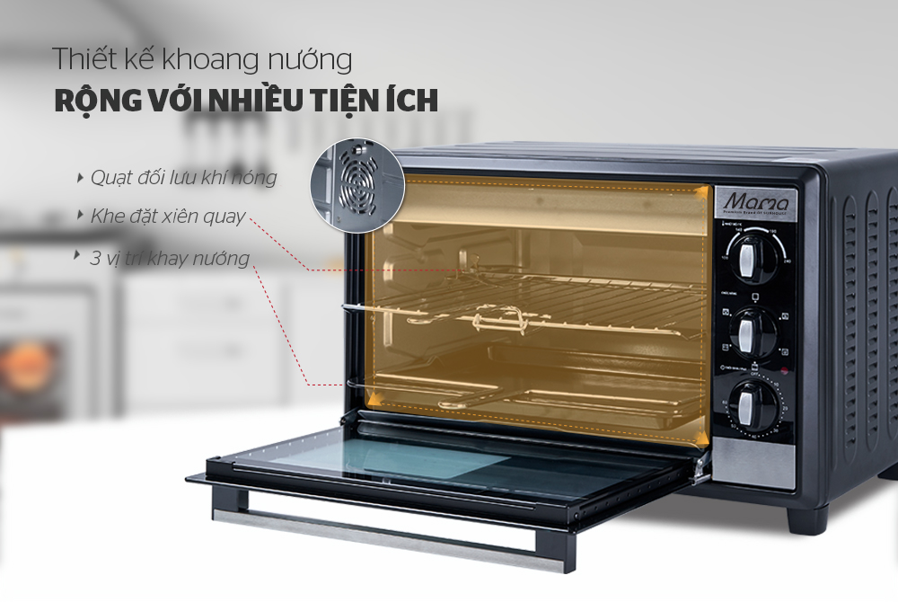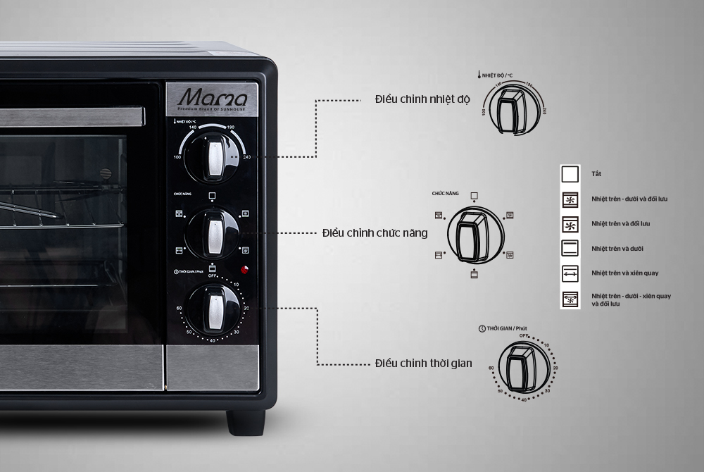 Lò nướng được trang bị 5 chế độ nhiệt khác nhau, phù hợp các mục đích nấu nướng và nhiều loại thực phẩm phong phú như: thịt gà, thịt lợn, thịt bò, cá, bánh mỳ, bánh xốp…