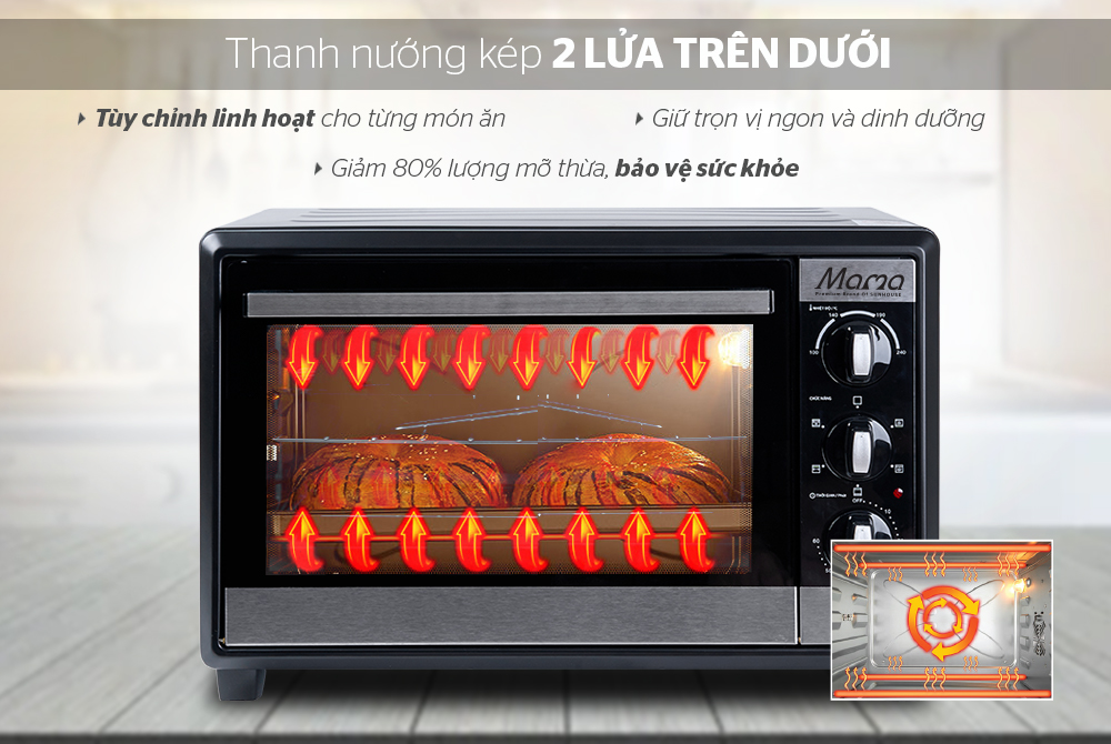 Với thanh nướng kép đối xứng ở phía trên và dưới, công nghệ đối lưu giúp thực phẩm trong lò luôn được nướng chín đều, thơm ngon, không bị cháy xém. Ngoài ra, công nghệ nướng không khói này còn giúp giữ được hương thơm tự nhiên cũng như chất lượng dinh dưỡng của món ăn.