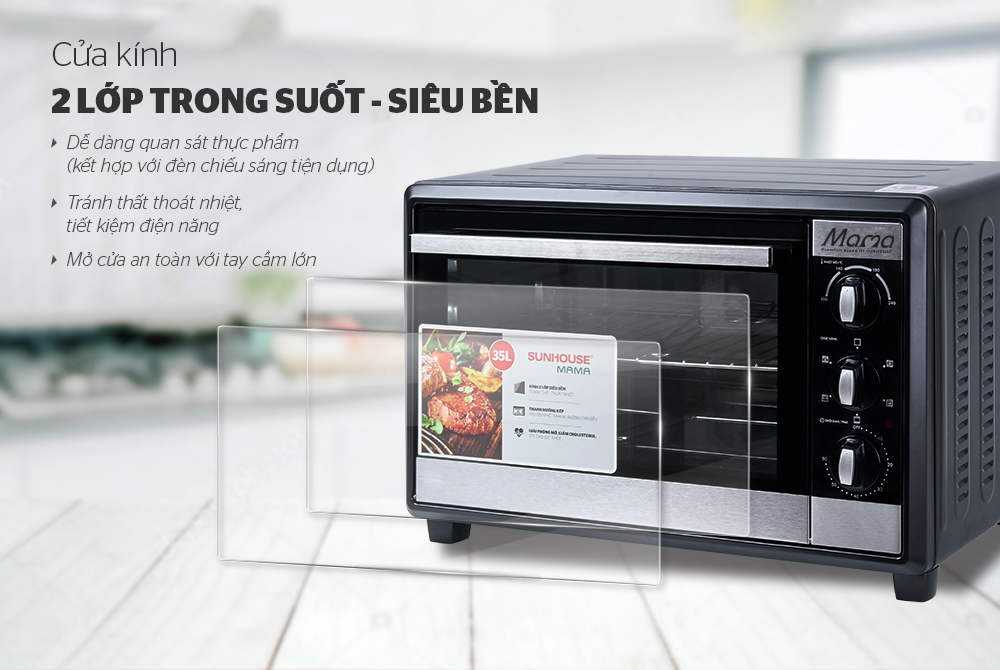 Lò nướng SUNHOUSE MAMA SHD4235 với dung tích 35L là lựa chọn tuyệt vời đối với những gia đình có 4 - 6 thành viên, có thể sử dụng cho tất cả các loại thịt cá và rau củ. Các chức năng của lò được điều khiển dễ dàng thông qua núm vặn, rất phù hợp với những người mới bắt đầu sử dụng lò nướng hiện đại.