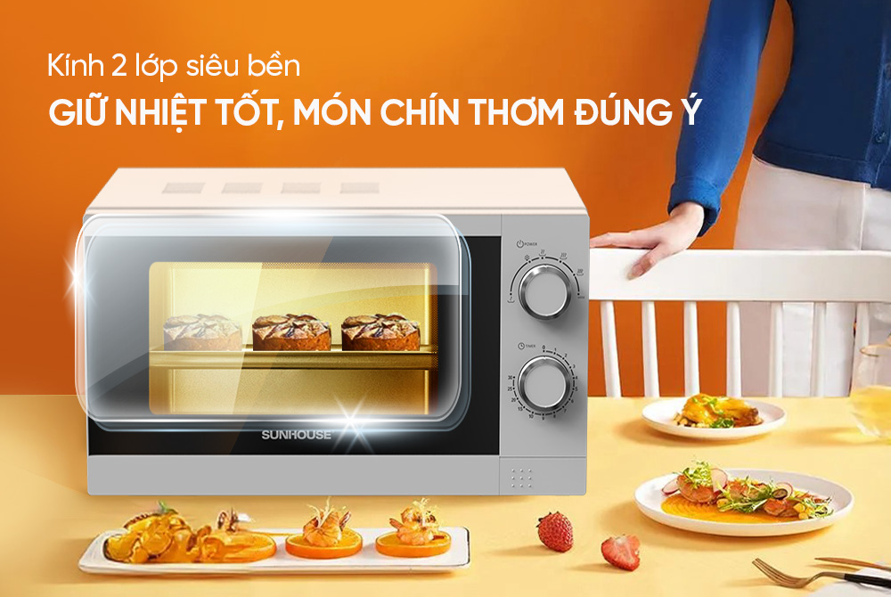 Lò vi sóng 20l Sunhouse SHD4819 sử dụng kính 2 lớp siêu bền, có khả năng giữ nhiệt hiệu quả, các món ăn không chỉ chín đều mà còn giữ được độ thơm ngon ấm nóng và dinh dưỡng tối ưu. Lớp kính bền bỉ cũng giúp tăng độ bền của lò vi sóng, bảo vệ gia đình bạn trong suốt quá trình sử dụng.