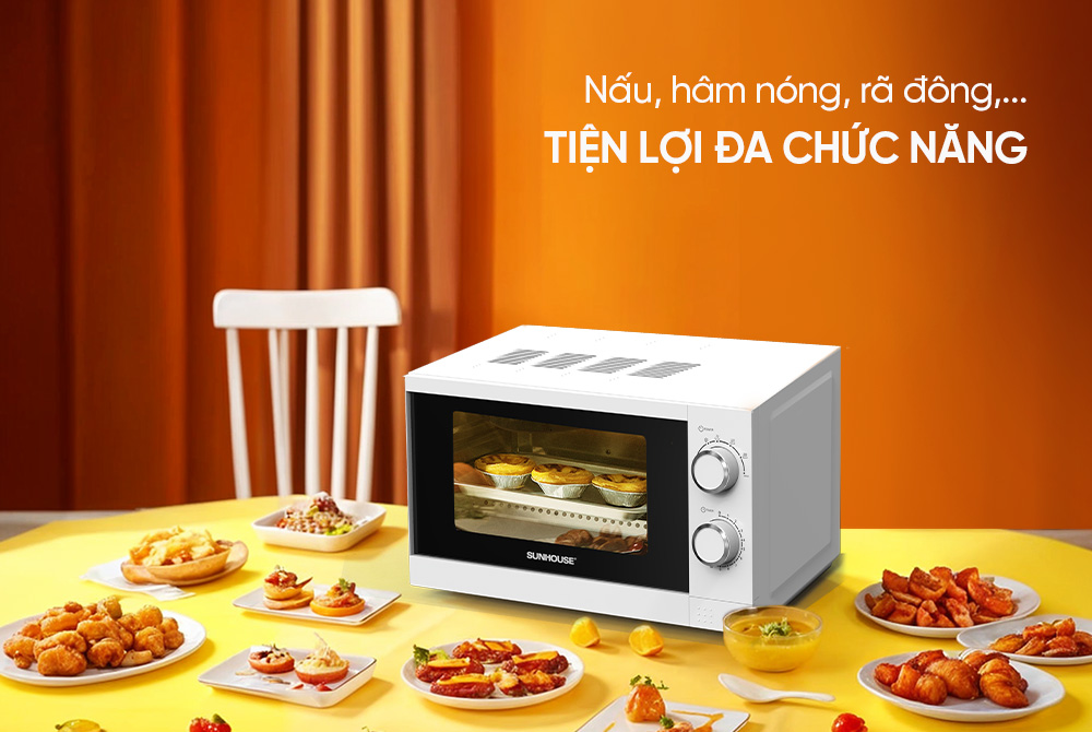 Lò vi sóng Sunhouse mang lại sự tiện lợi và linh hoạt cho người sử dụng với 6 chế độ nấu khác nhau như nấu, hâm nóng, rã đông,... phù hợp cho nhiều loại thực phẩm khác nhau. Từ việc chuẩn bị bữa sáng nhanh gọn đến bữa tối ấm cúng, bạn đều có thể thực hiện dễ dàng chỉ trong vài phút.