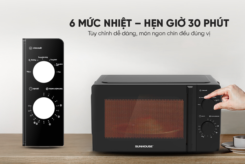 Lò vi sóng 20L Sunhouse SHD4822 hỗ trợ chế độ nấu linh hoạt: hâm nóng, nấu, rã đông,... phục vụ đa dạng nhu cầu nấu nướng hằng ngày. Với 6 mức nhiệt linh hoạt giúp điều chỉnh phù hợp từng món ăn, chế độ hẹn giờ đến 30 phút đảm bảo món ăn được chế biến chuẩn thời gian mong muốn, tránh quá chín. Chức năng khởi động nhanh tiết kiệm thao tác, đặc biệt phù hợp với cuộc sống bận rộn.
