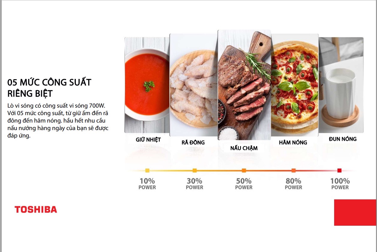 Toshiba MWP-MM20P(WH) có 5 mức công suất riêng biệt với 3 chức năng chính: nấu, hâm, rã đông, đáp ứng đa dạng nhu cầu nấu nướng hàng ngày của người dùng.  Đặc biệt là chức năng rã đông thực phẩm theo thời gian và trọng lượng, tránh lãng phí năng lượng không cần thiết.