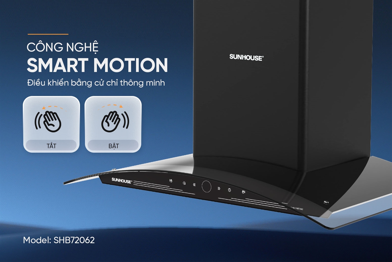 Bên cạnh bảng điều khiển cảm ứng với màn hiển thị rõ nét, nằm ngay trước tầm mắt giúp người dùng dễ dàng thao tác trong việc sử dụng, sản phẩm máy hút mùi kính cong SHB72062 còn được cải tiến với tính năng điều khiển bằng chuyển động thông minh. Chỉ bằng thao tác vẫy tay nhẹ nhàng, người dùng đã có thể bật tắt máy và điều chỉnh tốc độ hút mùi một cách tiện lợi mà không không sợ tay dính dầu mỡ làm vấy bẩn bề mặt thiết bị khi sử dụng.