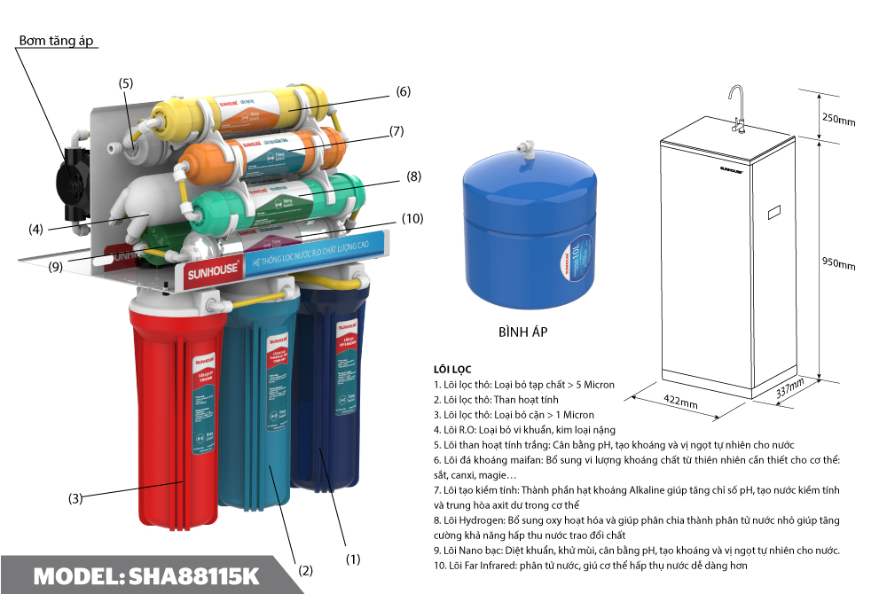 Nhờ trang bị tới 10 lõi lọc, mỗi lõi có 1 công năng riêng biệt nên máy lọc nước R.O SUNHOUSE SHA88115K có khả năng loại bỏ các tạp chất kim loại nặng, độc tố gây ung thư, bệnh đường tiêu hoá, viêm dây thần kinh, thoái hoá cột sống đau lưng,... Loại bỏ vi khuẩn có kích thước lớn hơn ≥ 1µm, bẩn bùn và đất rỉ sét có kích thước ≥ 5µm. Đặc biệt, sản phẩm còn có khả năng hấp thụ cao mùi vị, chất hữu cơ, thuốc trừ sâu, chất diệt côn trùng, Clo dư trong nước.