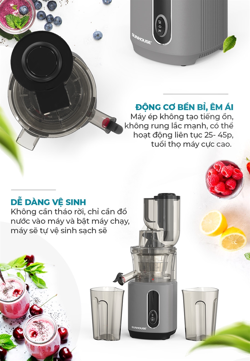 - Máy ép Sunhouse có phụ kiện làm từ nhựa AS có độ bền cao, hạn chế rạn nứt, an toàn cho sức khỏe, dễ dàng chùi rửa.