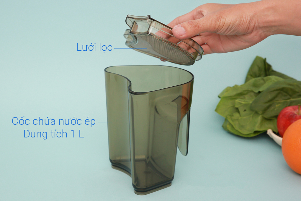 Cốc đựng nước ép dung tích 1 lít có thêm lưới lọc giúp lọc sạch tối đa bã rau củ, mang đến những ly nước ép sánh mịn