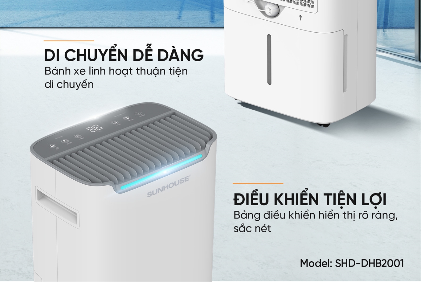 Máy hút ẩm SUNHOUSE SHD-DHB2001 có thiết kế nhỏ gọn, tối giản nhưng không kém phần sang trọng, phù hợp với nhiều không gian như phòng khách hoặc phòng ngủ. Bốn bánh xe di chuyển linh hoạt giúp bạn dễ dàng thay đổi vị trí sử dụng. Bảng điều khiển cảm ứng hiện đại cùng màn hình LED hiển thị rõ nét, giúp người dùng thao tác nhanh chóng và tiện lợi.