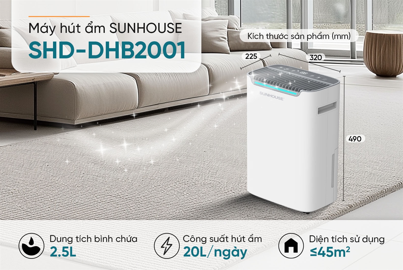 Nhờ công suất 365W, dung tích hút ẩm 20L/ngày, SHD-DHB2001 giúp không khí có độ ẩm cân bằng, từ đó duy trì nhiệt độ phòng ổn định, tạo cảm giác thoải mái và dễ chịu cho cả gia đình. Bạn sẽ không phải lo lắng tình trạng không khí khô hanh hoặc quá lạnh sau khi sử dụng máy hút ẩm. Máy hút ẩm Sunhouse SHD-DHB2001 phù hợp nhất với những không gian có diện tích dưới 45m2, hoạt động êm ái cùng khả năng hút ẩm mạnh mẽ, ngăn ngừa nấm mốc, vi khuẩn phát triển. Ngoài ra, sử dụng máy hút ẩm Sunhouse giúp bảo vệ đồ đạc, nội thất, cải thiện chất lượng không khí, mang lại cho gia đình cuộc sống khỏe mạnh hơn.