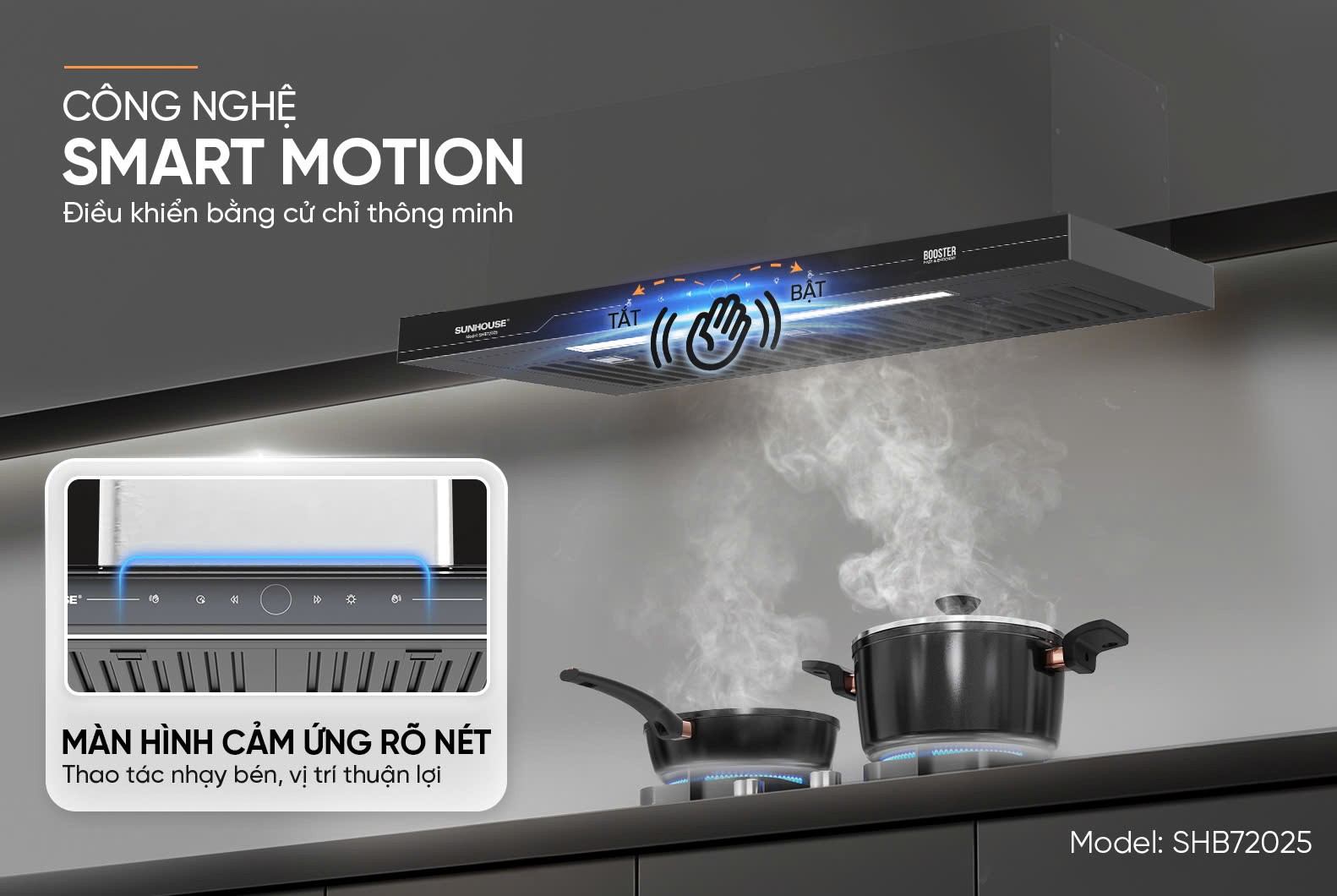Máy hút mùi SUNHOUSE SHB72025 ứng dụng công nghệ cảm biến cử chỉ thông minh Smart Motion, mang đến trải nghiệm điều khiển hoàn toàn không chạm. Chỉ với thao tác cái vẫy tay, người dùng có thể dễ dàng bật/tắt máy hoặc điều chỉnh tốc độ hút theo nhu cầu. Tính năng này không chỉ đảm bảo bề mặt máy luôn sạch sẽ, giảm thiểu tiếp xúc trực tiếp để hạn chế vi khuẩn, mà còn tiện lợi khi bận rộn nấu nướng.