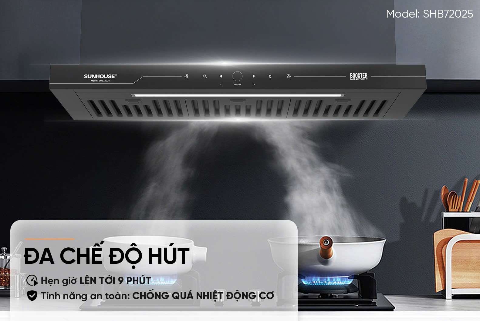 Máy hút mùi SUNHOUSE SHB72025 được trang bị chế độ Booster hút mạnh tiện dụng, cho phép máy tăng công suất hút lên mức tối đa 1600m3/h trong thời gian ngắn. Động cơ tua-bin với lực hút lớn và thiết kế cánh quạt tối ưu giúp tăng hiệu quả lọc khí, loại bỏ nhanh chóng mùi từ các món chiên xào, nướng hay khi có mùi cháy khét hoặc khói lan nhanh, Đặc biệt, chất liệu và khả năng tản nhiệt tốt giúp động cơ hoạt động bền bỉ, cho lực hút mạnh đều và ổn định. Nhờ khả năng vận hành linh hoạt, máy không chỉ loại bỏ mùi nhanh chóng mà còn hạn chế tối đa sự lan tỏa của mùi khó chịu sang khu vực xung quanh, để không gian sống luôn sạch sẽ và thoải mái.