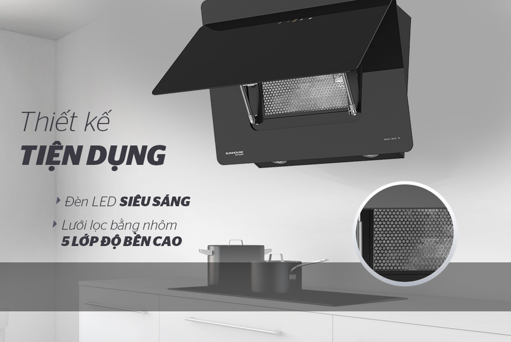 Máy hút mùi được thiết kế dạng kính vát mở khi sử dụng giúp hạn chế bắn bẩn lên trần kệ bếp. Sản phẩm còn có bề mặt nhẵn bóng liền khối, dễ vệ sinh lau chùi sau mỗi lần sử dụng. Đồng thời kết hợp với sử dụng lưới lọc hợp kim 3 lớp giúp ngăn chặn sự hình thành và bám dính tối đa của dầu mỡ. Bạn sẽ không còn phải tốn nhiều thời gian cho việc vệ sinh bảo quản máy hút mùi sau khi dùng nữa.