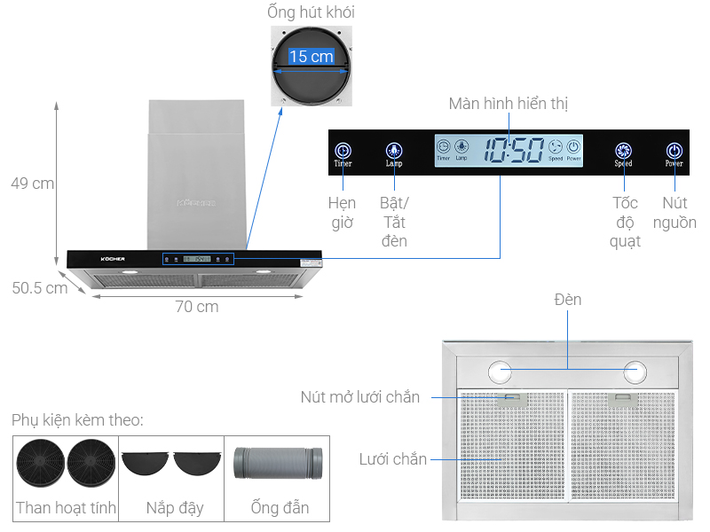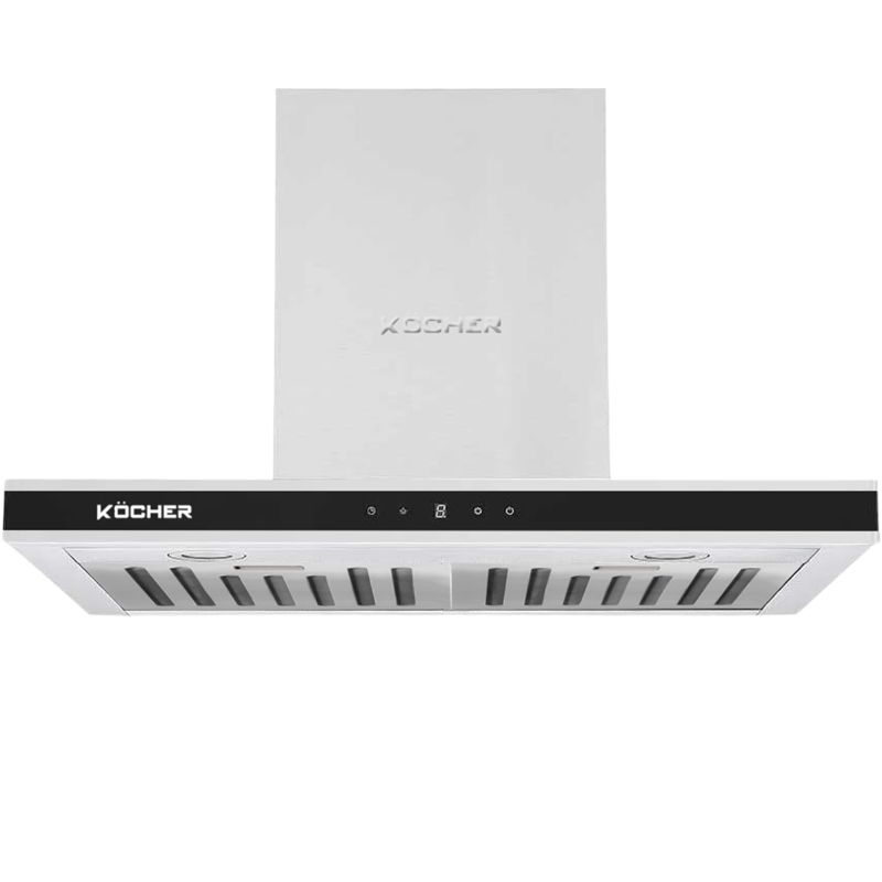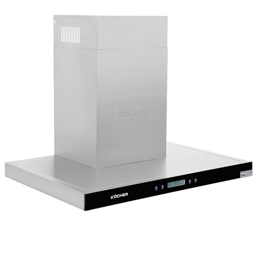 Máy hút mùi áp tường Kocher K-225C 70 có màu đen sang trọng, vỏ máy bằng thép không gỉ sáng đẹp