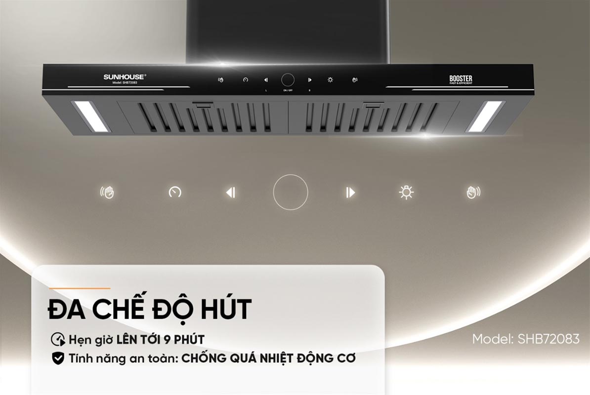 Máy hút mùi SUNHOUSE SHB72083 được trang bị 4 chế độ hút linh hoạt, dễ dàng điều chỉnh đáp ứng từng nhu cầu khác nhau – từ nhẹ nhàng cho các món hấp, luộc đến chế độ hút mạnh tối đa cho các món ăn nặng mùi hay các bữa tiệc thịnh soạn đậm đà hương vị.