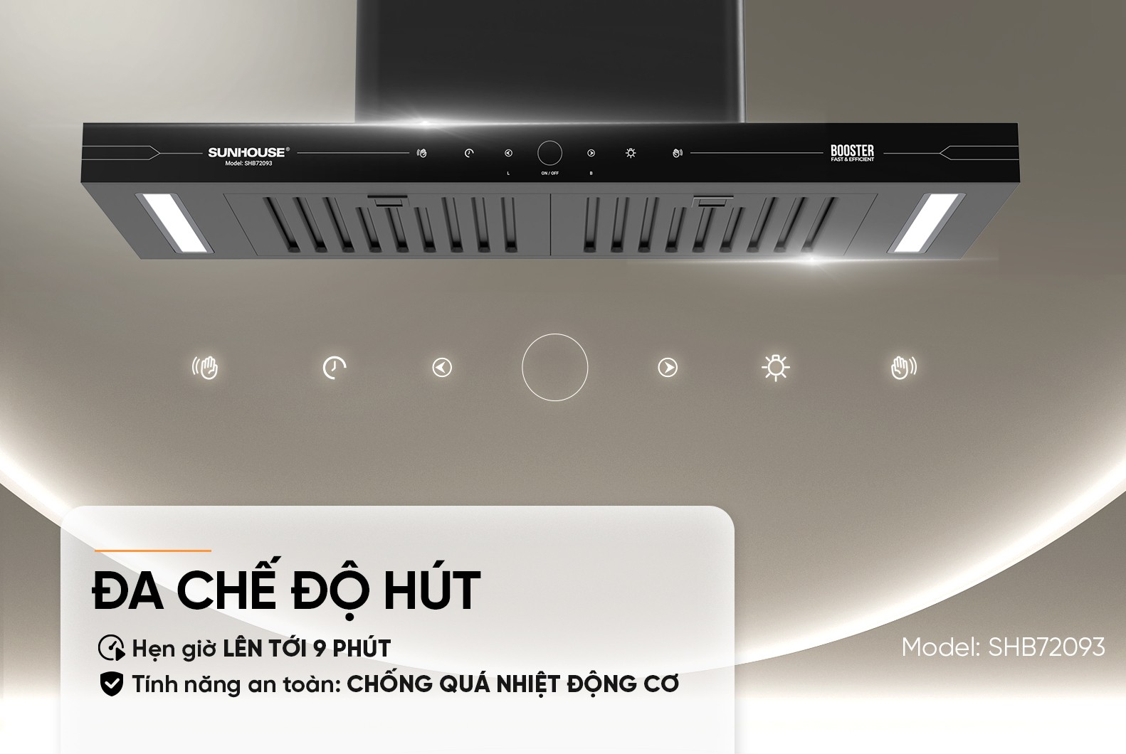 Máy hút mùi SUNHOUSE SHB72093 được trang bị chế độ Booster hút mạnh tiện dụng, cho phép máy tăng công suất hút lên mức tối đa 1400m3/h trong thời gian ngắn. Động cơ tua-bin với lực hút lớn và thiết kế cánh quạt tối ưu giúp tăng hiệu quả lọc khí, loại bỏ nhanh chóng mùi từ các món chiên xào, nướng hay khi có mùi cháy khét hoặc khói lan nhanh, Đặc biệt, chất liệu và khả năng tản nhiệt tốt giúp động cơ hoạt động bền bỉ, cho lực hút mạnh đều và ổn định. Nhờ khả năng vận hành linh hoạt, máy không chỉ loại bỏ mùi nhanh chóng mà còn hạn chế tối đa sự lan tỏa của mùi khó chịu sang khu vực xung quanh, để không gian sống luôn sạch sẽ và thoải mái.