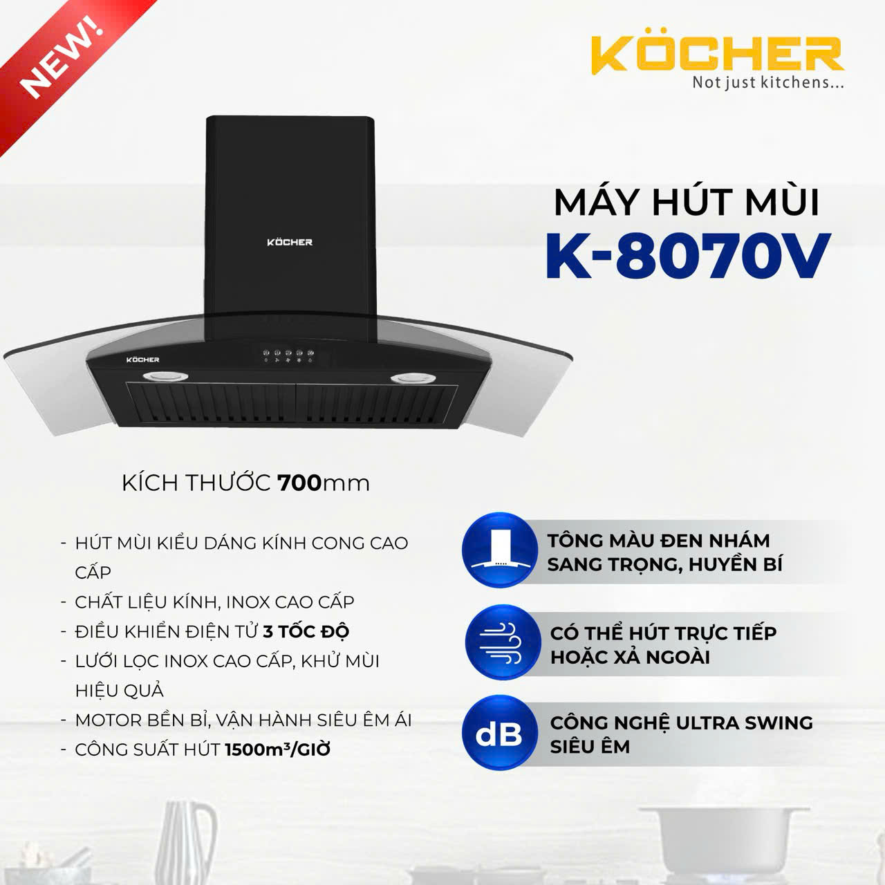 Kocher cho ra mắt sản phẩm máy hút mùi cao cấp kính cong K-8070V với sức hút mạnh mẽ mang tới không khí trong lành cho không gian bếp nhà bạn.