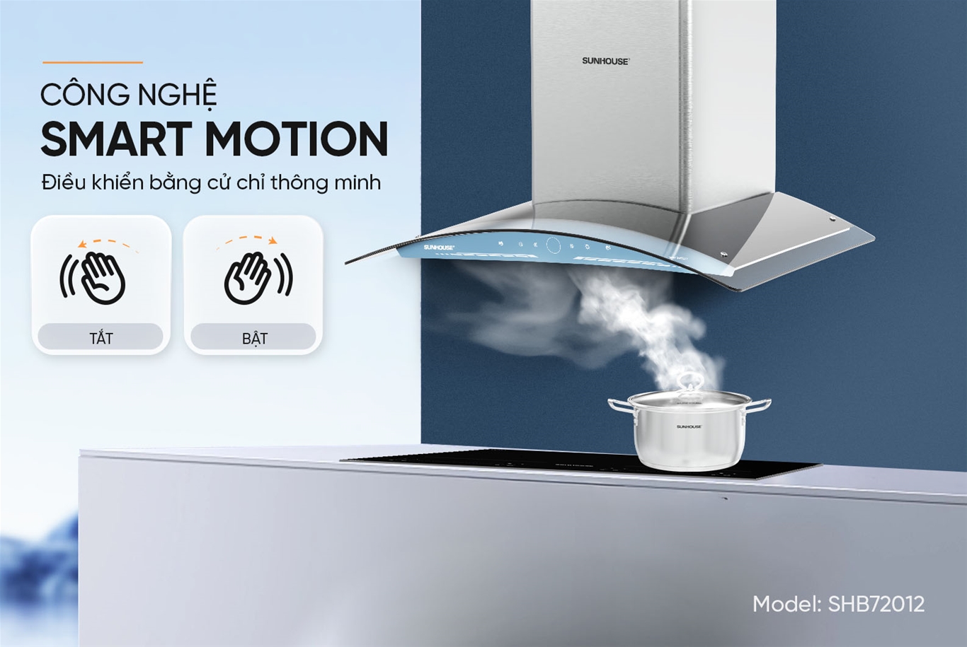 Bên cạnh bảng điều khiển cảm ứng với màn hiển thị rõ nét, nằm ngay trước tầm mắt giúp người dùng dễ dàng thao tác trong việc sử dụng, sản phẩm máy hút mùi kính cong SHB72012 còn được cải tiến với tính năng điều khiển bằng chuyển động thông minh. Chỉ bằng thao tác vẫy tay nhẹ nhàng, người dùng đã có thể bật tắt máy và điều chỉnh tốc độ hút mùi một cách tiện lợi mà không không sợ tay dính dầu mỡ làm vấy bẩn bề mặt thiết bị khi sử dụng.