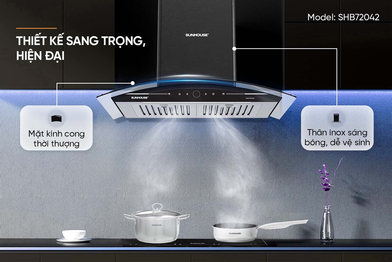 Máy hút mùi đang dần trở nên quen thuộc đối với các gia đình, đặc biệt đối với những căn hộ chung cư, nhà bếp phong cách hiện đại…Với sứ mệnh đem đến cho khách hàng một căn bếp luôn thoáng khí, đồ vật không bị ám mùi, SUNHOUSE cho ra mắt sản phẩm máy hút mùi kính cong SUNHOUSE SHB72042. Với những ưu điểm như công suất hút lớn, độ ồn thấp, dễ dàng điều khiển và vệ sinh…sản phẩm chính là khoản đầu tư đáng giá cho căn bếp mà bạn không thể bỏ lỡ.