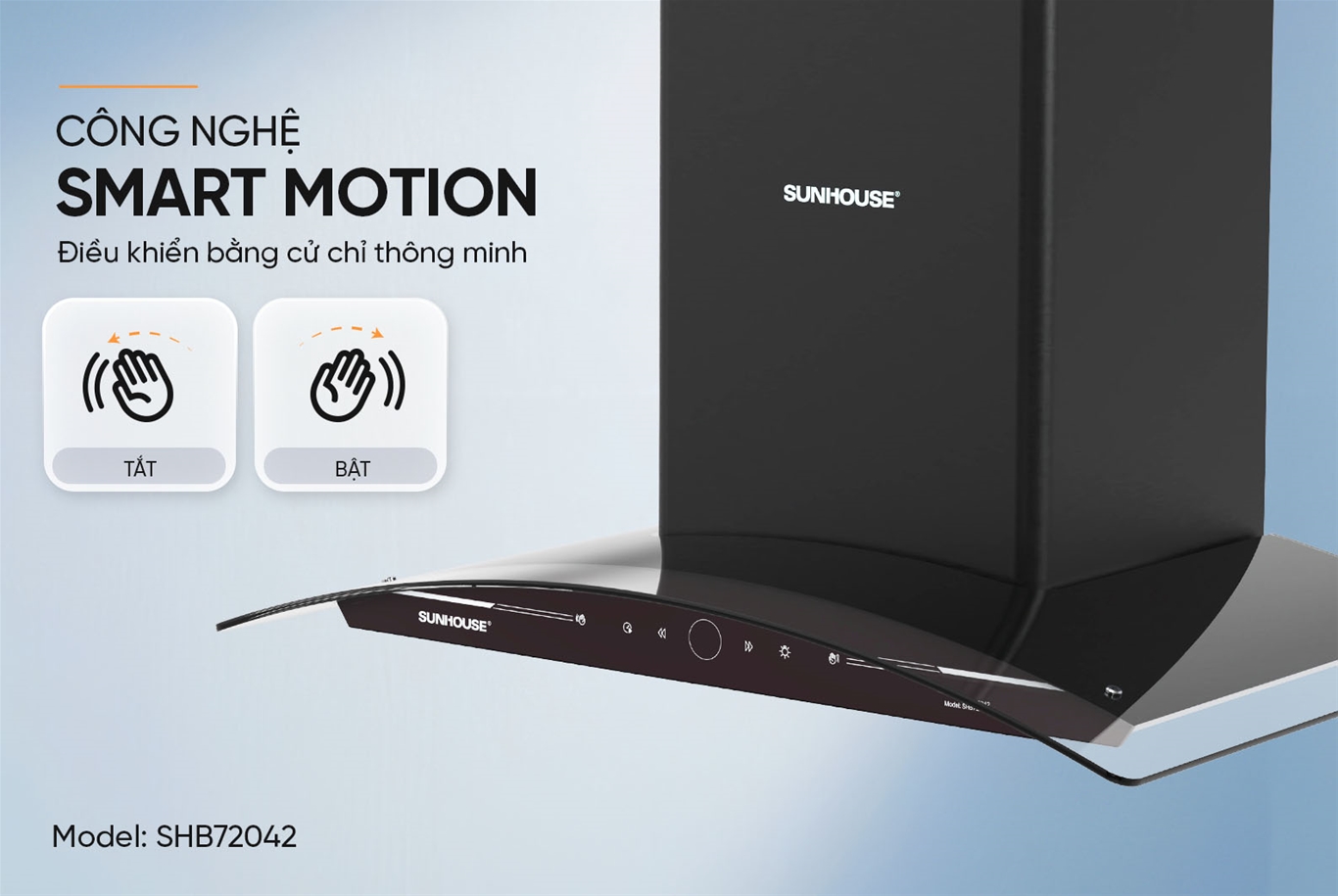 Bên cạnh bảng điều khiển cảm ứng với màn hiển thị rõ nét, nằm ngay trước tầm mắt giúp người dùng dễ dàng thao tác trong việc sử dụng, sản phẩm máy hút mùi kính cong SHB72042 còn được cải tiến với tính năng điều khiển bằng chuyển động thông minh. Chỉ bằng thao tác vẫy tay nhẹ nhàng, người dùng đã có thể bật tắt máy và điều chỉnh tốc độ hút mùi một cách tiện lợi mà không không sợ tay dính dầu mỡ làm vấy bẩn bề mặt thiết bị khi sử dụng.
