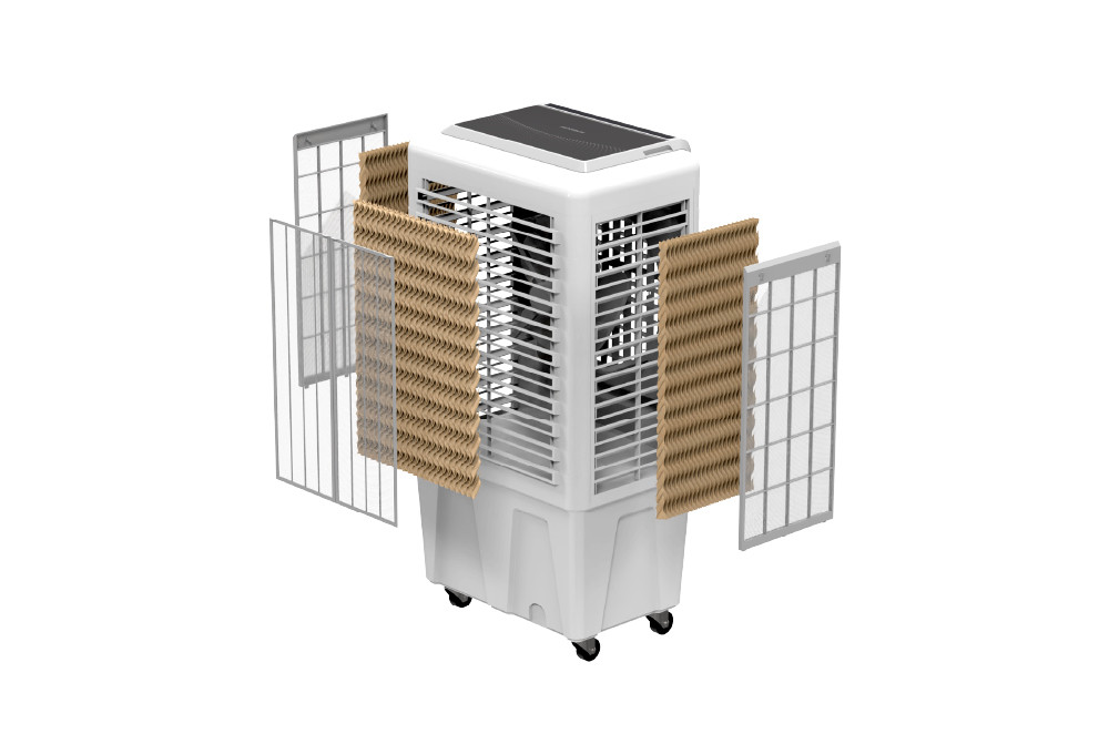 Luồng không khí cũng được lọc sạch qua một lớp lưới nhựa. Cơ chế là lưới lọc bụi sẽ giữ lại các bụi lớn và tấm làm mát khi đang ướt nước sẽ giữ lại các hạt bụi cỡ nhỏ hơn (vì thế nên bạn phải thường xuyên vệ sinh 2 bộ phận này).
