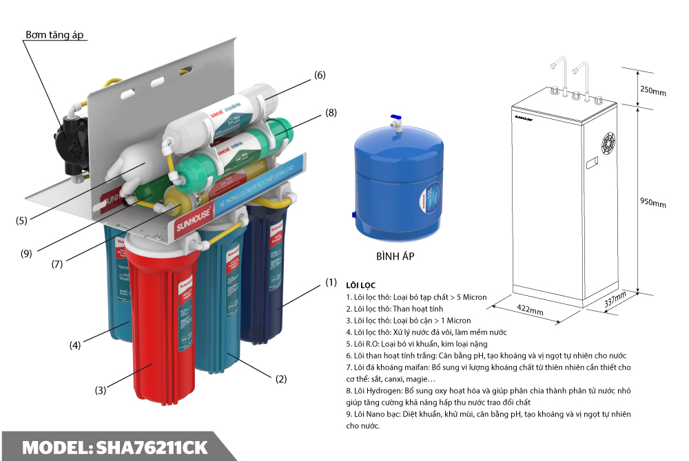 SHA76211CK có khả năng loại bỏ các vi khuẩn có kích thước lớn hơn ≥ 1µm, tạp chất kim loại nặng, độc tố gây ung thư, bệnh đường tiêu hoá, viêm dây thần kinh, thoái hoá cột sống đau lưng, …bảo vệ sức khỏe cho cả gia đình.