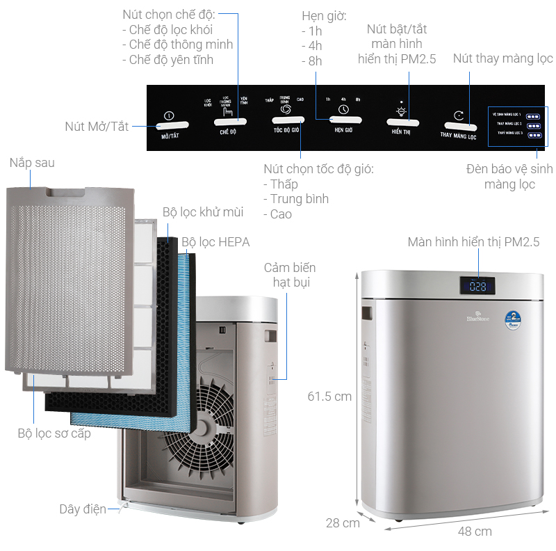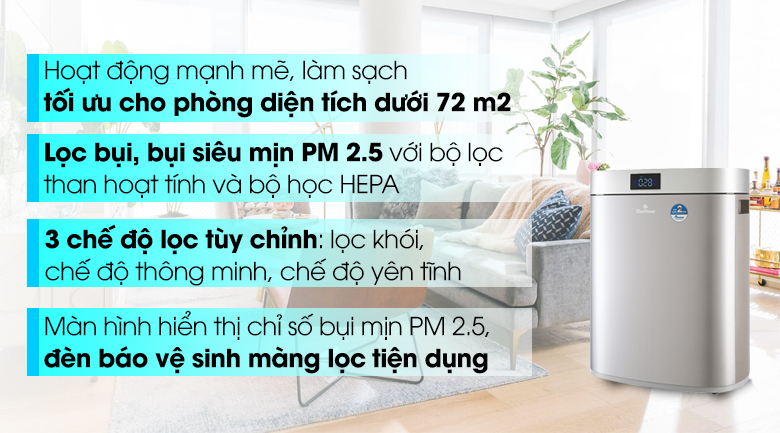 - Màng Hepa 12 cấp loại bỏ đến 99.9% các tạp chất có trong không khí với kích thước lọc siêu nhỏ đến 0.3 micron, giảm được các loại khí độc hại khác như formaldehyde, xử lý tốt bụi siêu mịn PM 2.5.