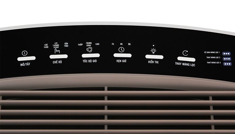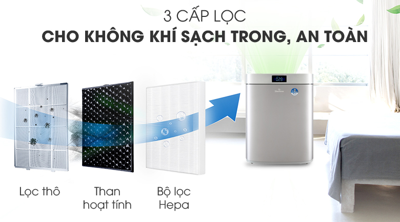 Máy lọc không khí có khả năng lọc sạch hiệu quả với hệ lọc 3 lớp gồm bộ lọc thô, lọc Hepa và lọc than hoạt tính với 3 cấp độ lọc từ thấp, trung bình đến cao