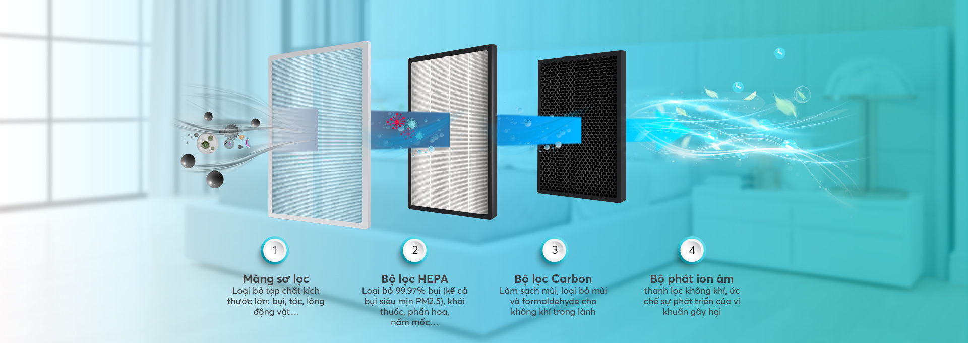 - Màng lọc HEPA lọc sạch 99.97% bụi bẩn, kể cả bụi mịn PM2.5, cho không khi chuẩn xanh sạch