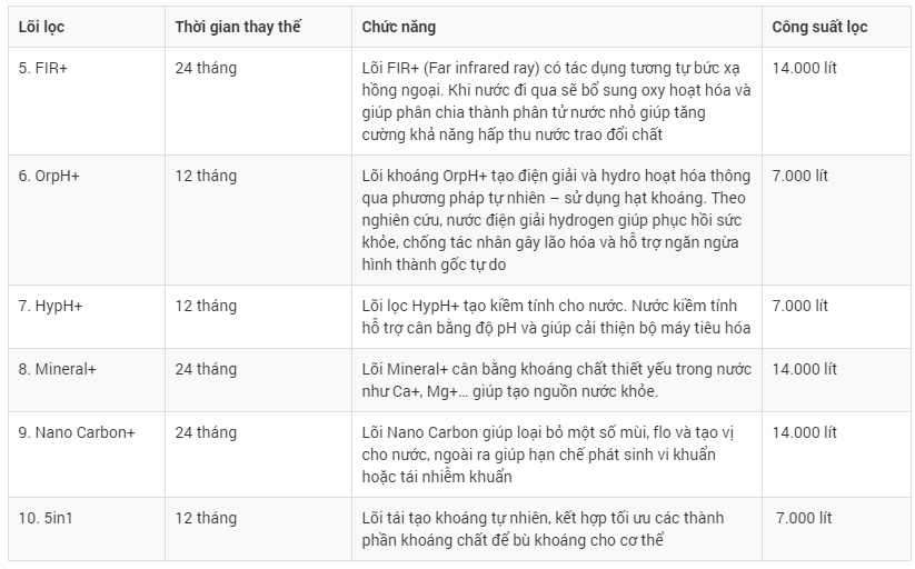 Được trang bị nhiều lõi lọc, trong đó 6 lõi chức năng lọc với khả năng chia tách phân tử nước, bổ sung các khoáng chất như Ca2+, Mg2+,K+, Na+, Fe2+ cho nước đồng thời tạo nước Hydrogen. Việc kết hợp tối ưu 6 lõi lọc chức năng, đặc biệt bổ sung thêm lõi 5 in 1, cho hàm lượng khoáng và Hydrogen đến hơn 25% so với thế hệ máy đời đầu
