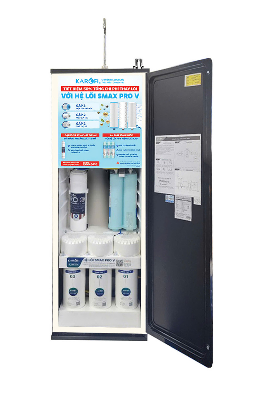 Hệ thống lọc: Hệ thống lọc 10 lõi Smax độc quyền: cụm 3 lõi lọc thô Smax Pro V; màng RO; hệ thống lõi chức năng HP 6.0 gồm các lõi Mineral (Khoáng đá), T33-GAC, Bioceramic, Far Infrared; Tourmaline; Nano Silver Plus